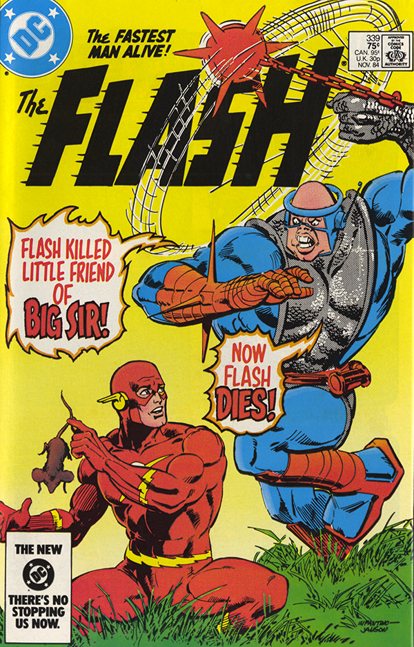 The issue opens with the A plot showing the Rogues about to send the childlike Dufus P. Ratchet, now known as Big Sir and armed with futuristic armor and weapons courtesy of the mysterious Monitor, on the trail of the Flash by convincing him that the Flash not only brutality beat them up, but that in the process he had also killed a tiny mouse (I guess they’re all pretty much tiny). Small animals are a pet peeve (absolutely intended) of Big Sir, and he takes off for and extended battle with the Flash during which he knocks out the Flash and flies off with him over his shoulder.