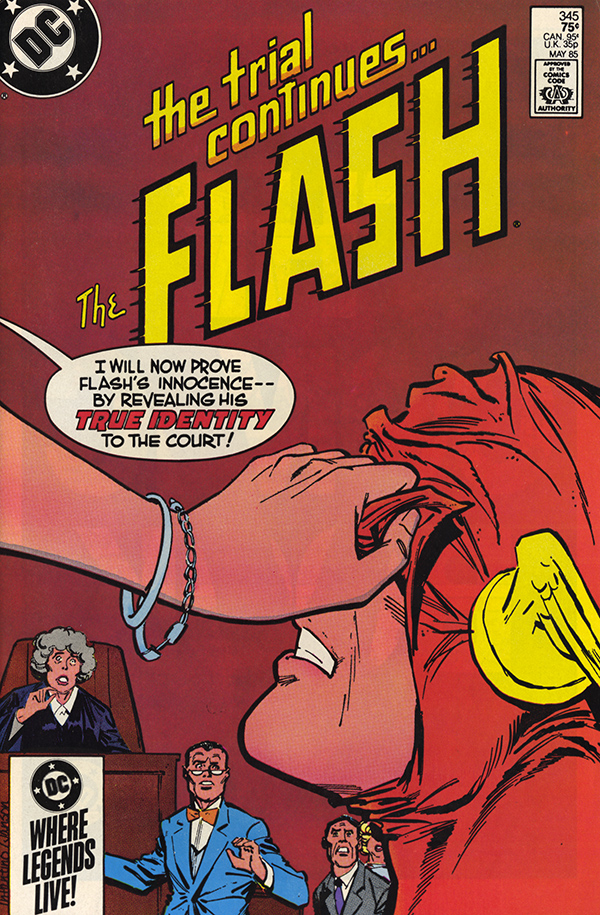 As the opening narration box exclaims: “A far-flung era in the distant future many centuries removed from the typical travails of life in 1985…” we see a prisoner, shown only as a field of energy, breaking out of a max-containment facility. Even though we can’t see the prisoner, I think we all pretty much know who it is (If you don’t, then you have to say three hail Mary’s, and hop back and start this blog thread again from the very beginning, froggy). The joy is immediate because we get to see some Carmine Infantino’s futuristic cityscapes, something at which he has no compeers. That alone is worth the 75 cent going rate for the book back then. The tableau then quickly shifts to the the courtroom where Kid Flash (Wally West, and one more hail Mary if you didn’t know that) is testifying for the prosecution in the Flash’s Murder trial. As he does so, he points out several ways by which the Flash could have disabled the Reverse-Flash without killing him. Despite Cecile Horton’s attempt to undercut it, the testimony is devastating. “Jump-cut to the blurry escapee from the far flung (you just can’t use flung enough as far as I’m concerned) future breaking into police headquarters and Barry Allen’s police lab leaving behind a puddle of glowing liquid on the floor in which you can see Flash boot prints (for my money, those traction treads were the coolest addition to the new uniform of the Flash when Carmine designed the new Silver Age look (and you don’t know what I’m talking about… aww forget it). Once again the blurred figure assaults the police headquarters only this time as a semi-solid figure. He enters the computer lab and removes some information from the computer. It’s later determined that certain selective information has been excised. More significantly, it’s info on every member of the Flash’s rogues gallery.